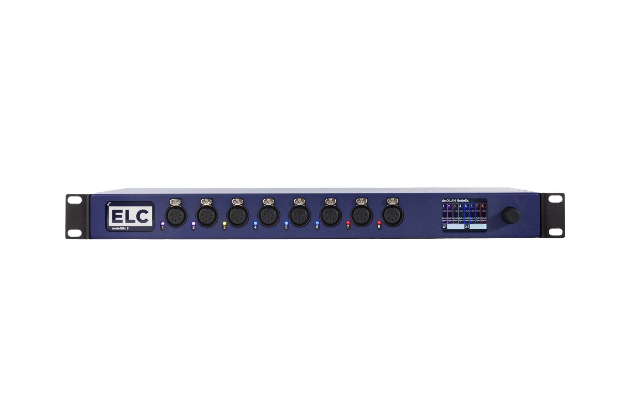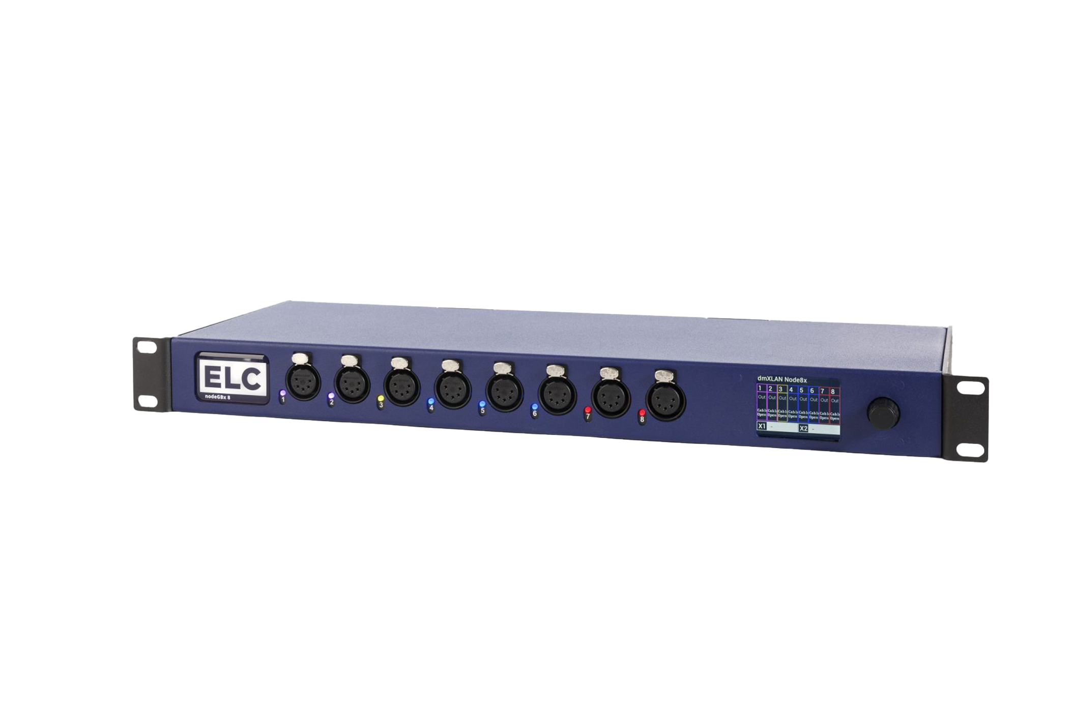 Functionality includes data splitting, merging, softpatching, and backup when programmed with ELC's dmXLAN software. Every DMX port features a programmable RGB LED indicator, and the output is continuously measured to detect changes and errors, which are shown on the node's display and in the dmXLAN software.